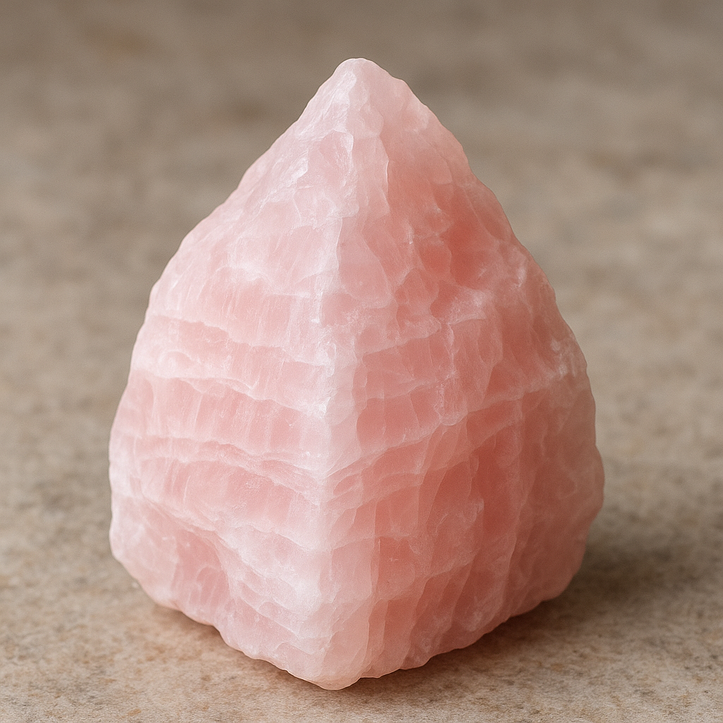 カルサイトは炭酸カルシウムを主成分とする鉱物で、非常に多くの色のバリエーションがあります。中でもピンクカルサイトは、優しい桜色や桃色を思わせる色合いで、見ているだけで気持ちが和らぐのが特徴です。ただし、硬度が低く傷つきやすいため、取り扱いには少し注意が必要です。