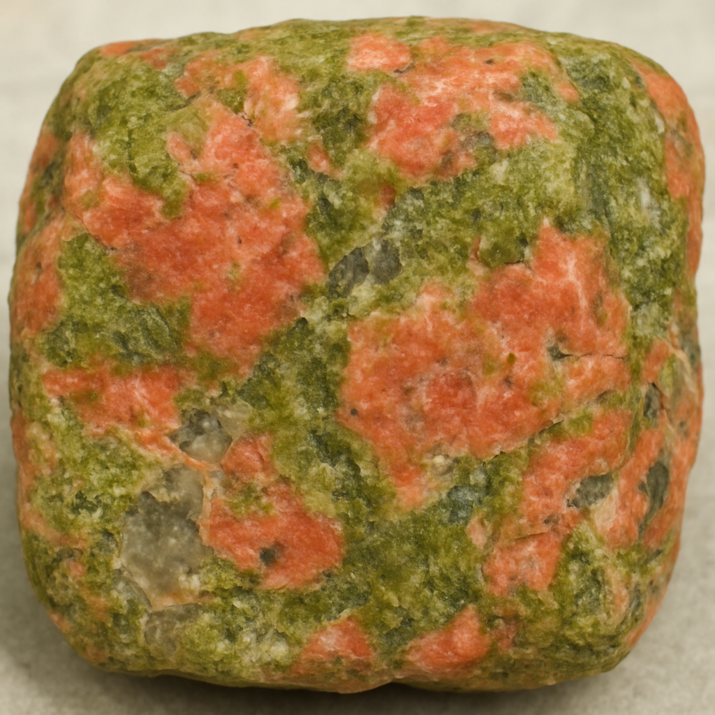 ユナカイトは単一の鉱物ではなく、複数の鉱物が混ざってできた「岩石」である点が特徴です。そのため、ひとつひとつ模様や色の出方が異なり、世界に同じものがない個性的な石です。