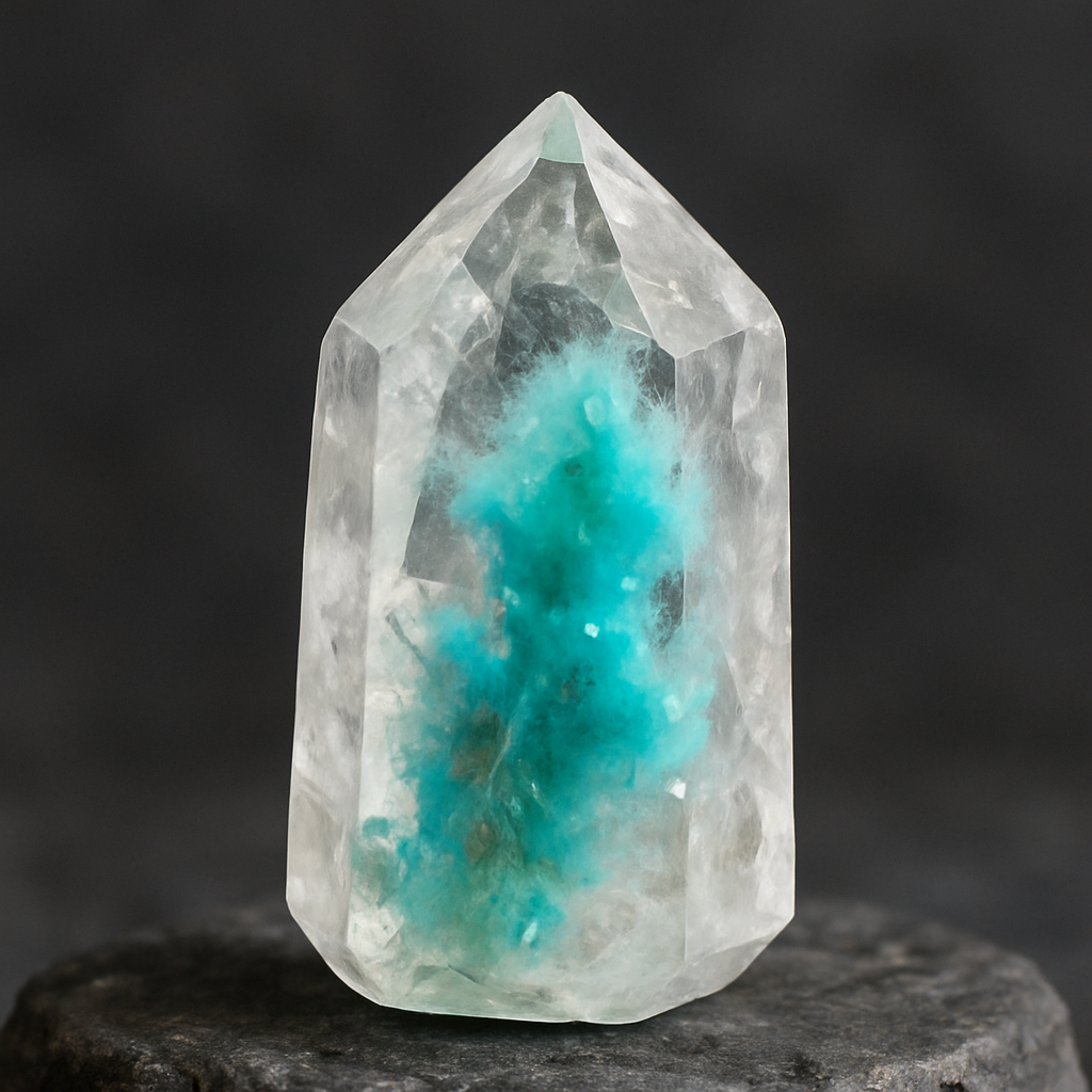 アホイト(Ajoite)は、銅を含むケイ酸塩鉱物の一種で、単体でも産出しますが、最も人気があるのは水晶の中にアホイトが内包されたタイプです。水晶の透明感の中に広がるブルーグリーンの模様は、まるで海や空を閉じ込めたかのような美しさがあります。
