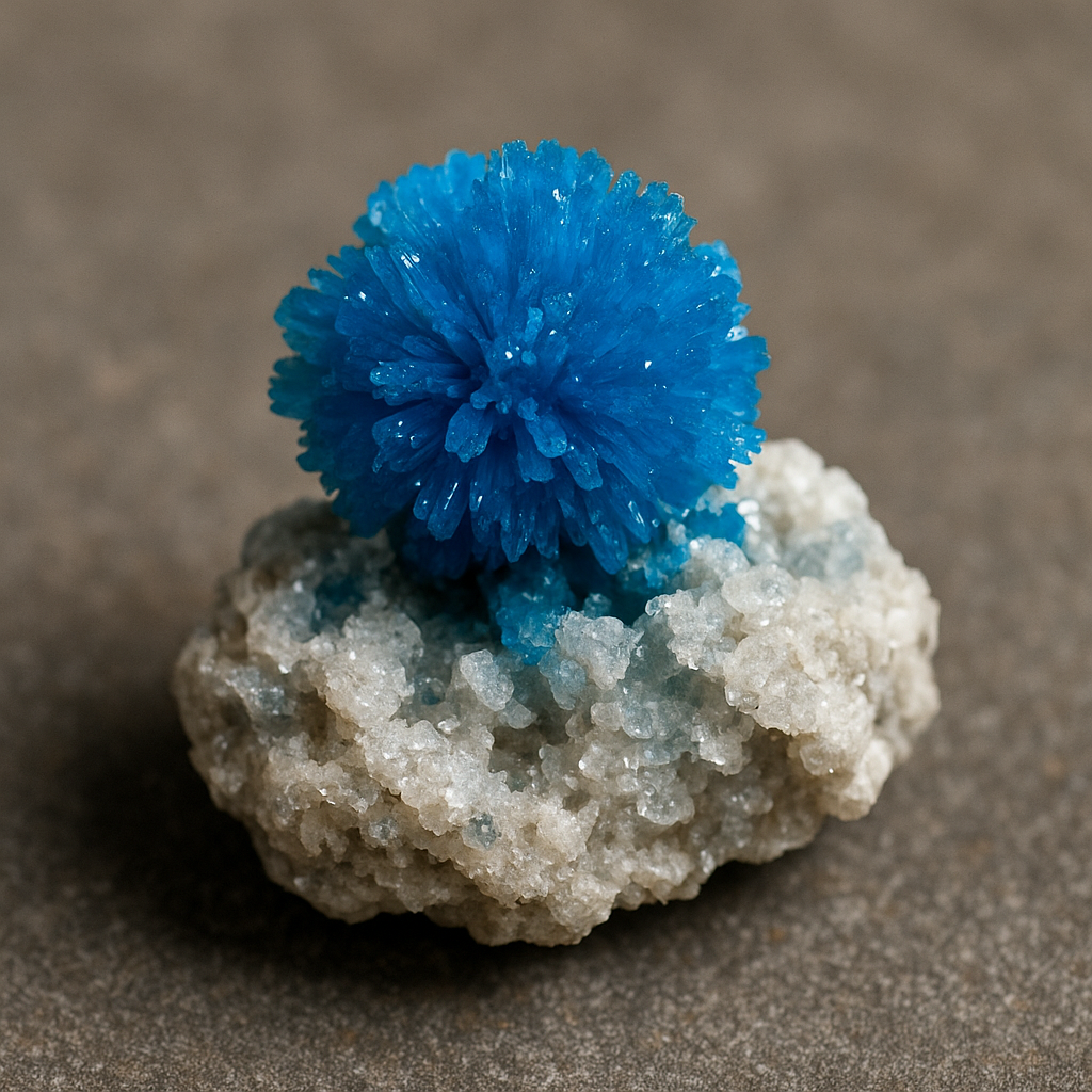 カバンサイトは、バナジウムを含むケイ酸塩鉱物で、鮮やかな青色の結晶が特徴的です。インドのプーナ地方で美しい標本が多く産出されることで有名ですが、流通量はそれほど多くなく、希少な石として扱われています。硬度が低く壊れやすいため、アクセサリーよりも原石のまま飾られることが多いのも特徴です。