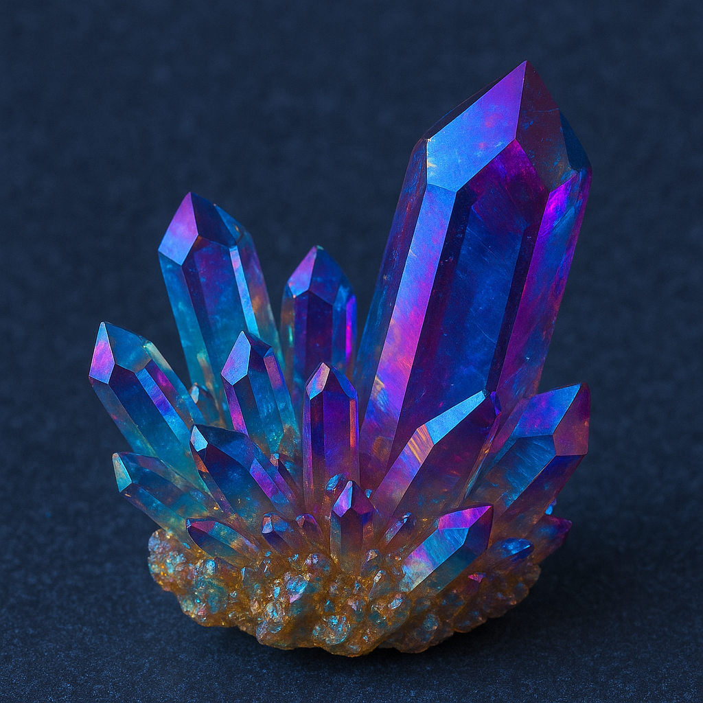 • 生成方法:天然の水晶(クリスタル)にチタンや金属を高温で蒸着させることで、独特の青紫〜虹色の輝きを持たせています。
