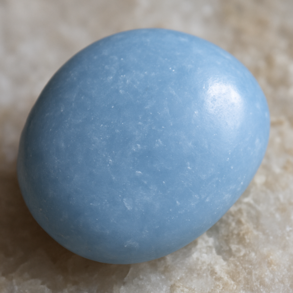 エンジェライトは元々「硬石膏(アンハイドライト)」と呼ばれる鉱物の一種で、水分を含まない石膏の変種です。透明感のあるやさしい空色が特徴的で、持つ人の心をすっと軽くしてくれるような印象を与えます。比較的柔らかい石なので、取り扱いには少し注意が必要です(衝撃や水に弱い)。