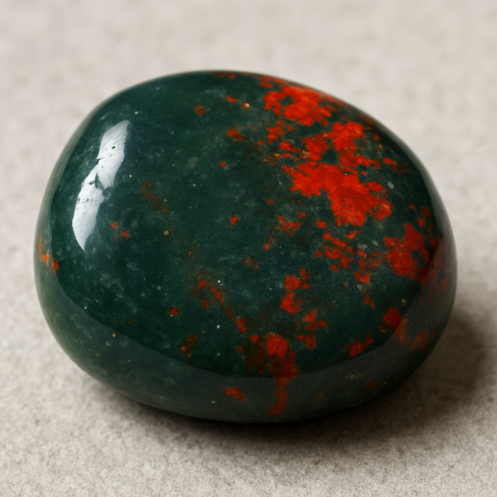 ブラッドストーンは、深い緑色の地に赤い斑点が入った印象的な天然石です。その姿から「血石(けっせき)」とも呼ばれ、古代から守護や勇気を与える石として珍重されてきました。