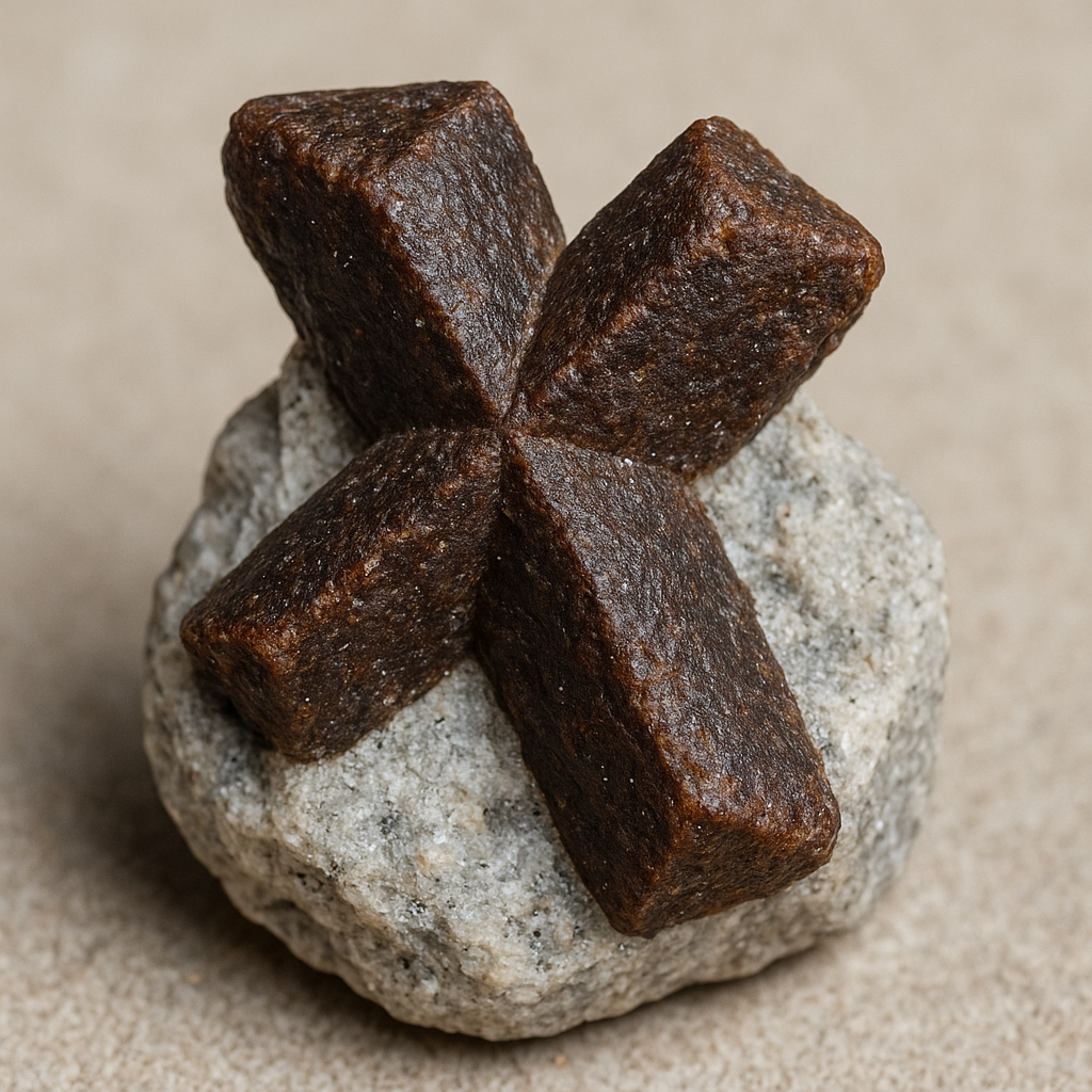 スタウロライトの最大の特徴は、自然の力で十字の形をした双晶(2つの結晶が交わって成長したもの)ができることです。この神秘的な形状から、ヨーロッパでは中世から「聖なる守りの印」として大切にされてきました。アメリカ・バージニア州では州の公式鉱物にも指定されているほど、歴史と文化に根付いた石です。